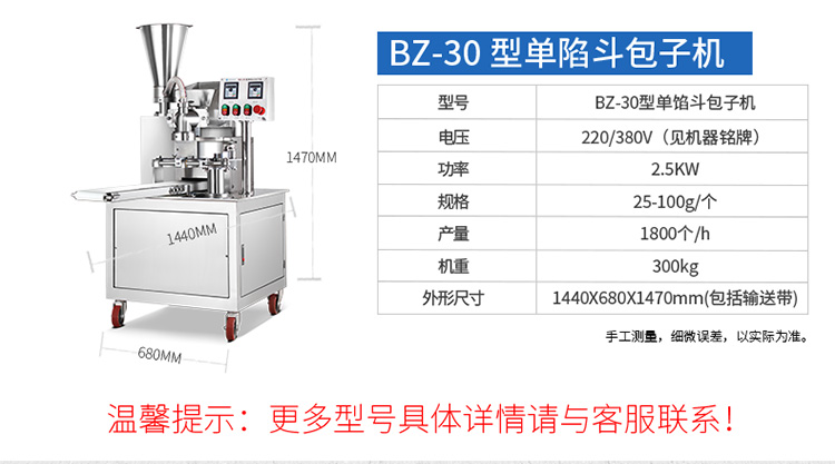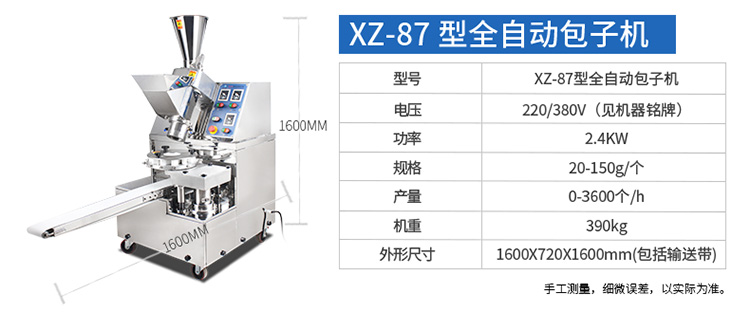 名稱(chēng)XZ-86型全自動(dòng)包子機(jī) 電源220/380V(見(jiàn)機(jī)器名牌) 功率2.4kw 產(chǎn)量0-3600個(gè)/小時(shí) 尺寸1600*720*1600mm(包括輸送帶) 重量350kg 規(guī)格20-150克/個(gè) 其他