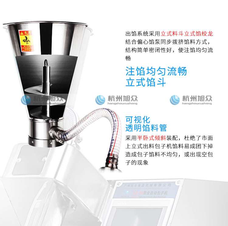◆出餡系統(tǒng):立式料斗,立式餡攪龍結(jié)合偏心餡泵同步撥擠餡料方式。結(jié)構(gòu)簡(jiǎn)單密閉性好。使注餡 均勻流暢,實(shí)用于決大多數(shù) 菜包,肉包,灌湯包,奶黃包,豆沙蓮蓉包 等餡料。并且餡管采用半臥式傾斜裝配,防止了市面上立式出料包子機(jī)餡料容易成團(tuán)下掉造成包子餡料不均勻或出現(xiàn)空包子的現(xiàn)象。