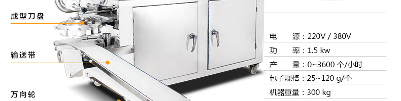 名稱XZ-290III卷面式包子機 電源220/380V(見機器名牌) 功率2.4kw 產(chǎn)量0-3600個/小時 尺寸2050*1470*1480mm(包括輸送帶) 重量400kg 規(guī)格25-130克/個 其他