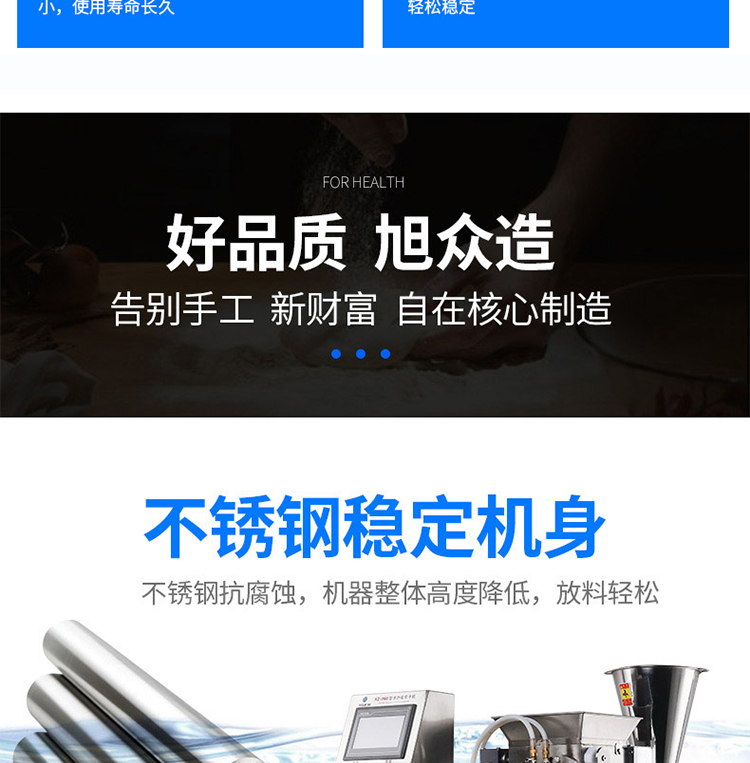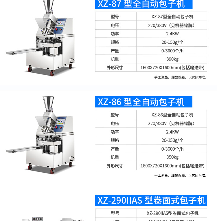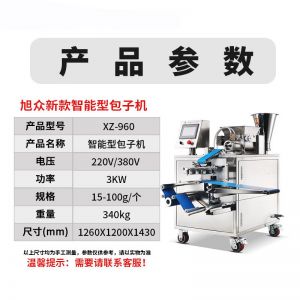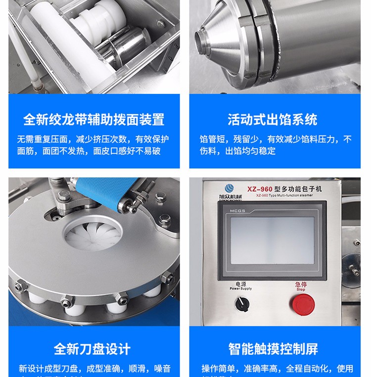 XZ-960多功能包子機采用新設計出面系統(tǒng),帶有輔助撥面裝置投面后無需重復使用手壓面/推面,有效提高工作效率/預防安全隱患;絞龍采用新概念,減少擠壓次數,有效保護面筋、面團不發(fā)熱,保證面皮的口感;做湯包時,皮可更薄,面皮里外更光滑(可當氣球吹大)有效保護餡料里面的湯汁不會漏出或被吸收;出面斗帶有自動恒溫制冷系統(tǒng)最低溫度可達2℃ ,冷媒:R134A(特殊要求可按要求定制)(若定制,貨期增加20天工作日);操作簡單易懂,拆裝簡單,清洗方便;適合產品范圍:湯包,小龍包,速凍包,生煎包,發(fā)面包子,各類餡料包子等產品