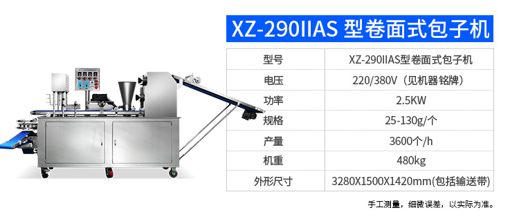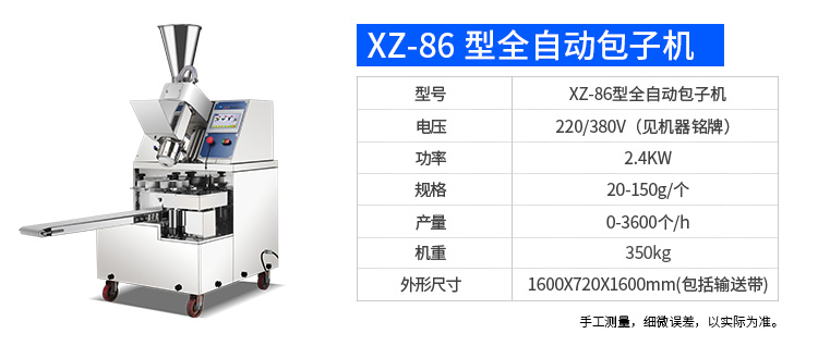名稱XZ-915全自動(dòng)包子機(jī) 電源220/380V 功率1.55kw 產(chǎn)量0-3600個(gè)/h 尺寸1530×670×1650mm 重量250kg 規(guī)格 其他