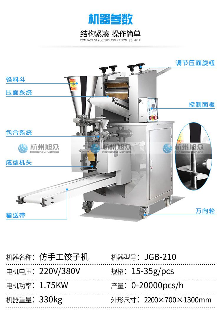 名稱JGB-210型仿手工餃子機 電源220/380V(見機器名牌) 功率1.75kw 產(chǎn)量0-20000個/小時 尺寸2220×700×1300mm 重量330kg 規(guī)格15-35克/個 其他