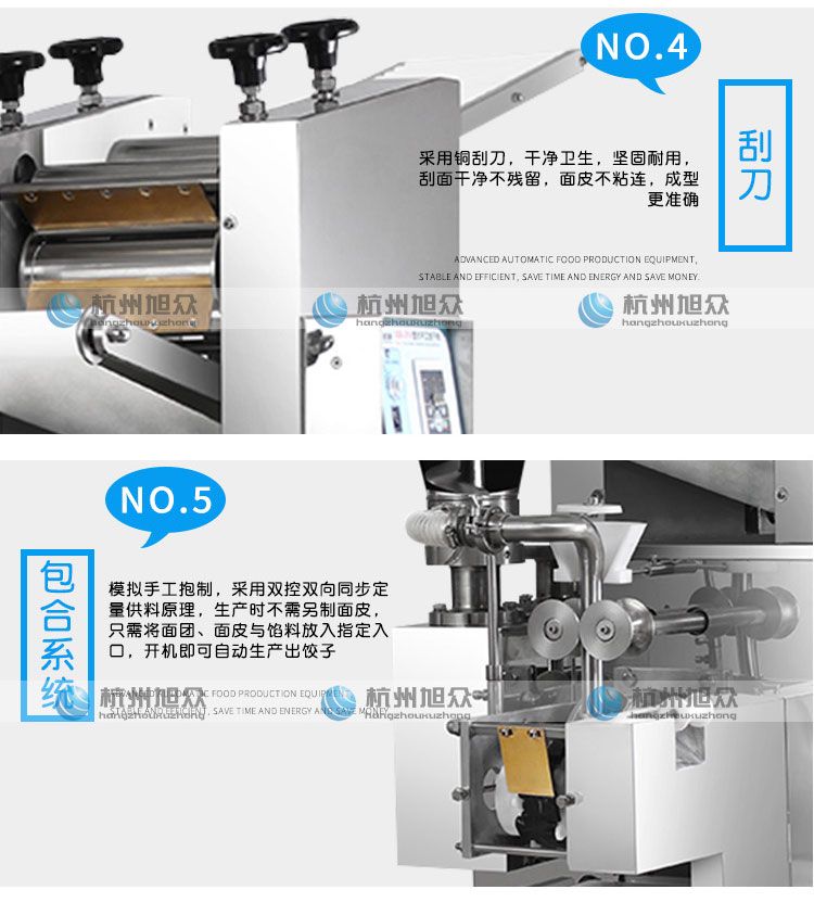 ?采用雙控雙向同步定量供料的方式,生產(chǎn)時只需將面團與餡料放入指定入口,開機即可自動生產(chǎn)出餃子;