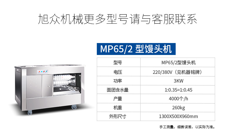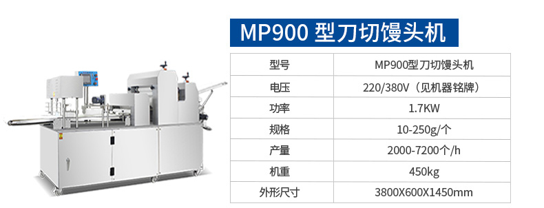 名稱MP800A型刀切饅頭機(jī) 電源220/380V(見(jiàn)機(jī)器銘牌) 功率0.6kw 產(chǎn)量2000-7200個(gè)/h 尺寸3300×560×1330mm 重量190kg 規(guī)格10-250g/個(gè) 其他