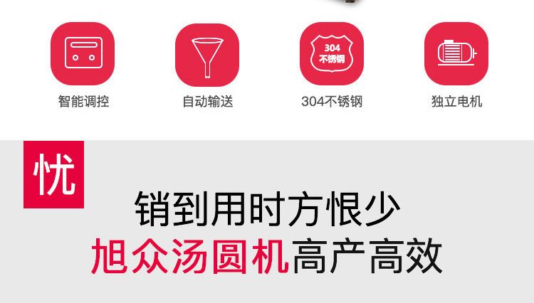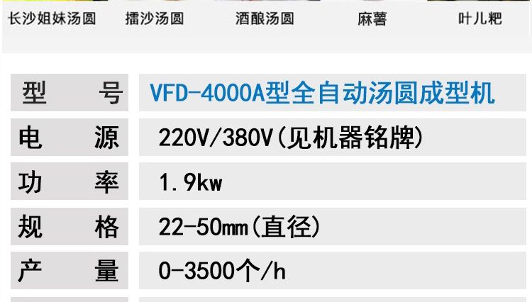 名稱VFD-4000A型全自動湯圓成型機 電源220/380V 功率1.9kw 產(chǎn)量0-3500個/小時 尺寸1300×1500×1100mm 重量300kg 規(guī)格22-50mm 其他